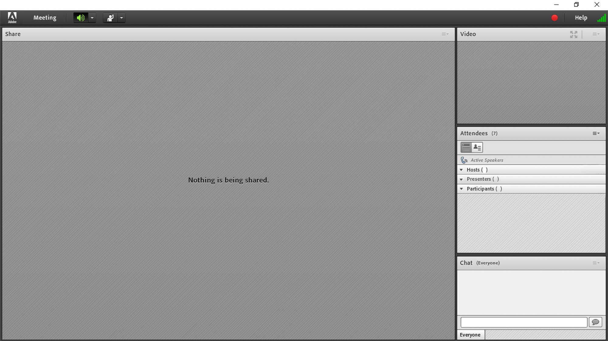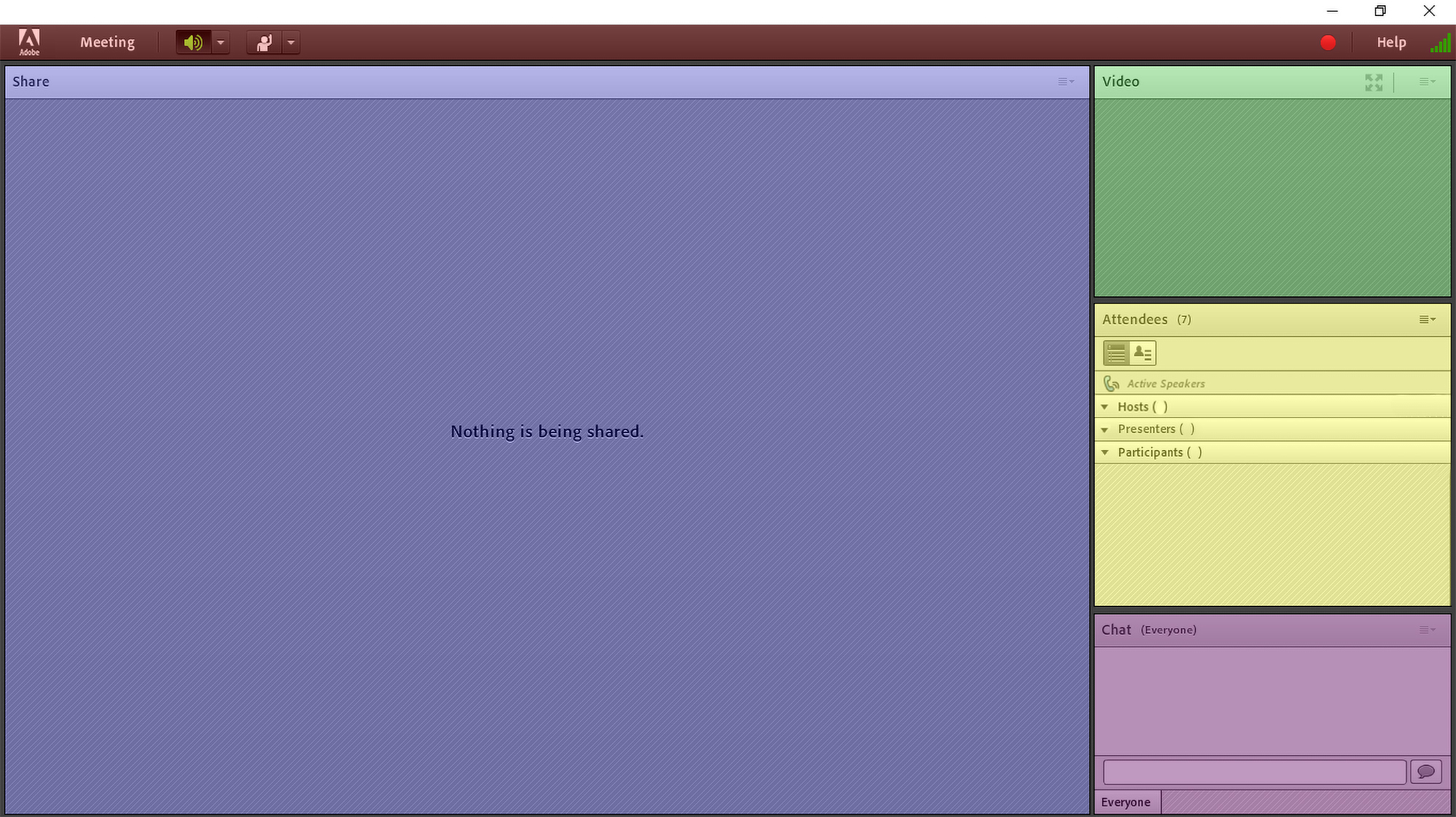 صفحه نمایش در Adobe Connect بهصورت بالا است. این محیط به ۵ بخش تقسیم میشود که به صورت زیر است: